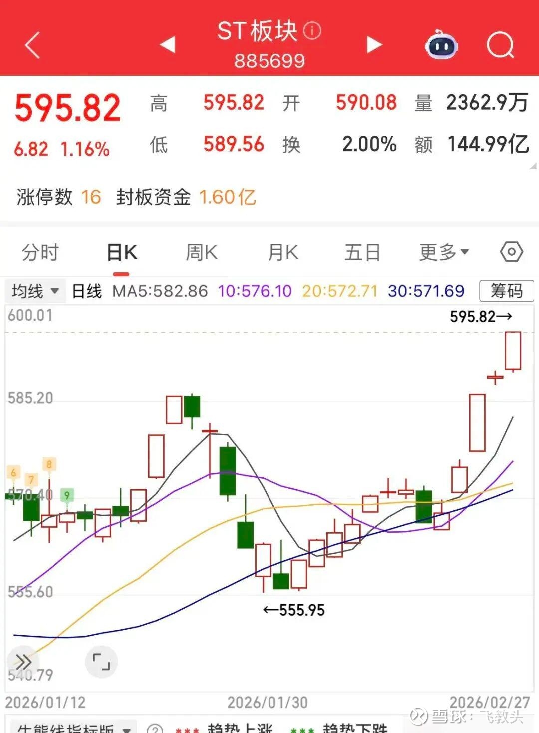 ST板块指数处于上涨阶段。从2025年1月30日的563点,到2月27日的595点,2月份整体上涨了32点。