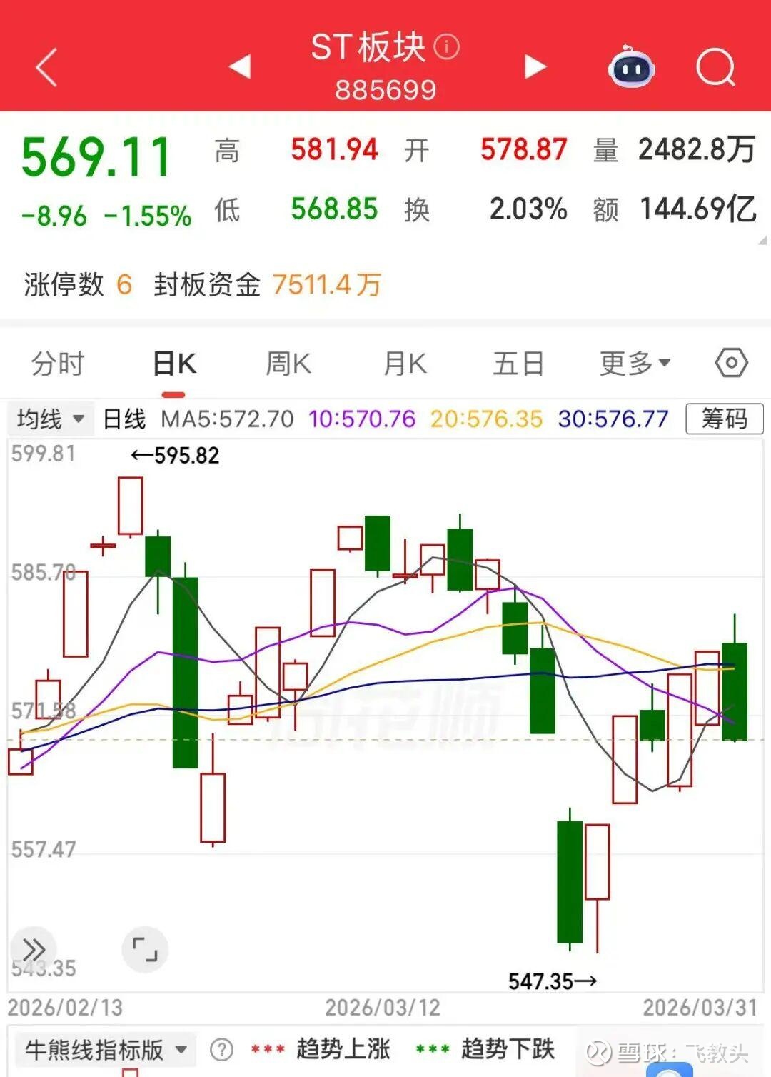 ST板块指数处于下跌阶段。从2026年2月27日的595点,到3月31日的569点,3月份整体下跌了26点。