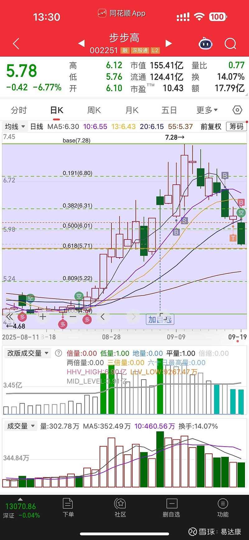 目前来看步步高这只个股价格差不多已经跌到0.618黄金分割线了,但是成交量相比于前面来说,缩的还不够,至少还得缩小一半才能算回调到位,这说明这只个股主力控盘力度还不够高,要么就有效跌破5.70左右位置你先割肉离场,要么就是继续扛着,我昨天继续加仓了,支撑位继续加仓试试水,如果错了我周一会割掉加仓的点位$步步高(SZ002251)$ ,有高手来给我更正一下逻辑吗