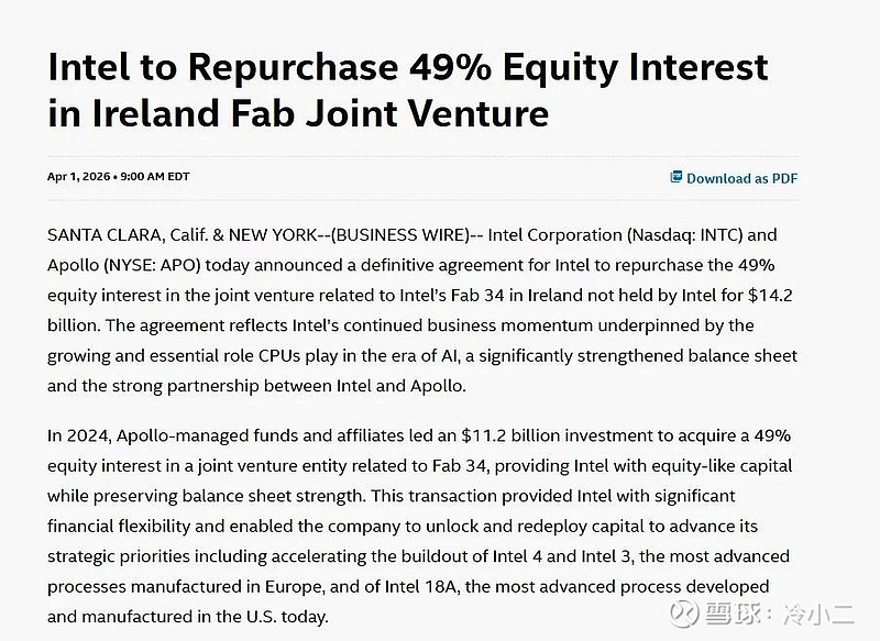 $英特尔(INTC)$ 和阿波罗全球管理今日宣布达成最终协议,英特尔将以142亿美元回购其在与位于爱尔兰的英特尔Fab 34工厂相关的合资企业中未持有的49%股权。2024年,阿波罗管理的基金及其关联公司牵头斥资112亿美元,收购了与Fab 34相关的合资企业49%的股权,为英特尔提供了类似股权的资本,同时保持了其资产负债表的稳健性。