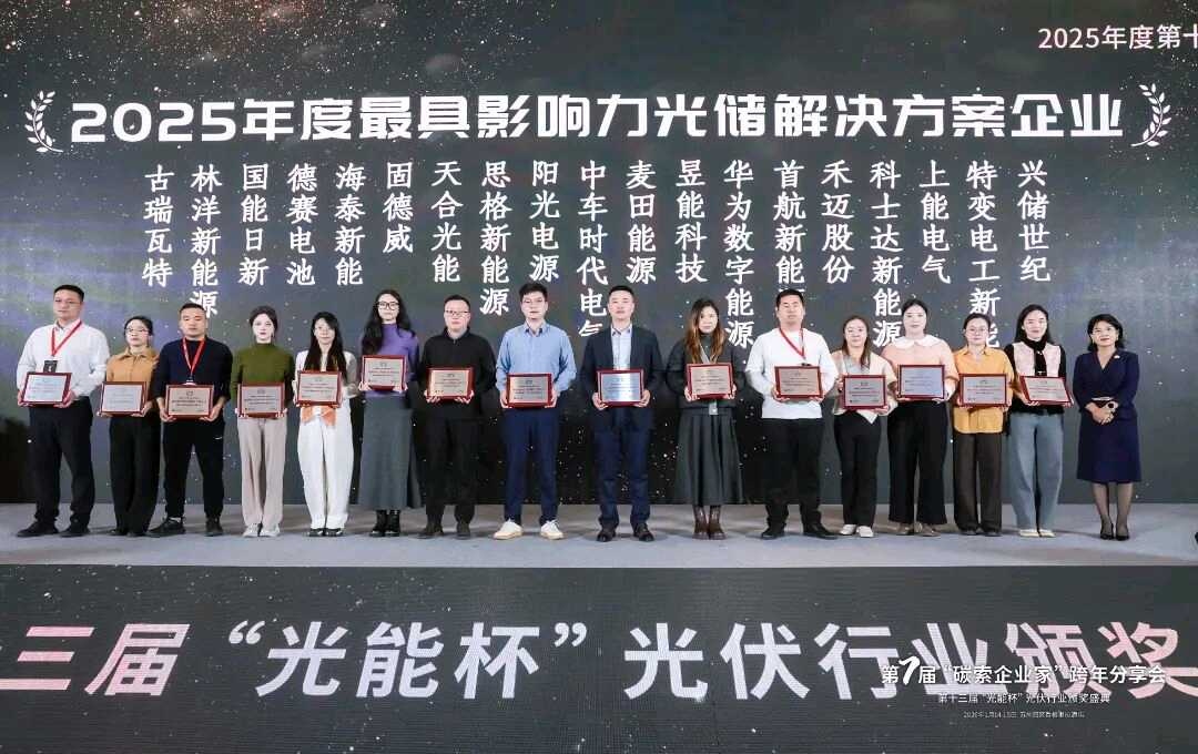 1月14日至1月15日,由索比光伏网、碳索研究院、碳索储能网等主办的2025年度碳索跨年分享会暨“光能杯”储能行业颁奖盛典在苏州隆重举行。自首届“光能杯”盛典启动至今,历经十余年沉淀,该评选已成为光储行业内极具权威与影响力的年度盛事。