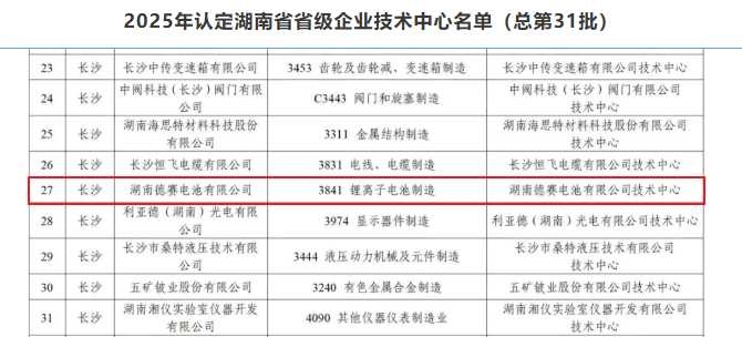 1月26日,湖南省工业和信息化厅正式发布《关于公布2025年认定湖南省省级企业技术中心名单(总第31批)的通知》。湖南德赛电池凭借完善的技术创新体系、持续稳定的研发投入以及在锂电池制造领域形成的核心技术优势,成功通过“湖南省省级企业技术中心”认定。