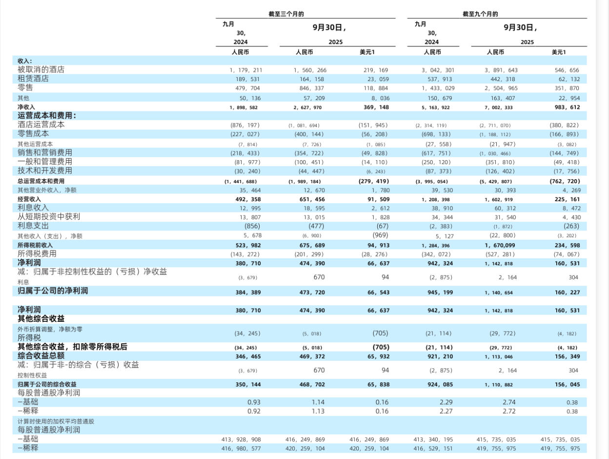 · 2025年第三季度的销售与营销费用为3.55亿元人民币(5,000万美元),而2024年同期为2.18亿元人民币。费用增加的主要原因是我们在品牌知名度方面的投入加大,以及线上渠道的有效拓展,这与我们零售业务的增长相一致。 2025年第三季度,销售与营销费用占净收入的13.5%,而2024年同期这一比例为11.5%。 · 2025年第三季度的总行政费用为1亿元人民币(1400万美元),其中包含1000万元人民币的股权激励费用;而2024年同期的总行政费用为8200万元人民币,其中股权激励费用为300万元人民币。剔除股权激励费用后,这一增长主要源于人工成本的增加。2025年第三季度,剔除股权激励费用后的总行政费用占净收入的比重为3.4%,而2024年同期这一比例为4.2%。 · 2025年第三季度的技术与开发支出为4,400万元人民币(600万美元),而2024年同期为3,000万元人民币。这一增长主要源于我们加大对技术系统和基础设施的投入,以支持不断扩大的酒店网络、零售业务,并提升客户体验。2025年第三季度,技术与开发支出占净收入的1.7%,而2024年同期这一比例为1.6%。 2025年第三季度其他营业净收入为1300万人民币(200万美元),而2024年同期为3500万人民币。 2025年第三季度的营业利润为6.51亿元人民币(9200万美元),而2024年同期为4.92亿元人民币。 2025年第三季度的所得税费用为2.01亿元人民币(2800万美元),而2024年同期为1.43亿元人民币。这一增长主要源于经营收入增加以及股息分配所引发的预扣税。