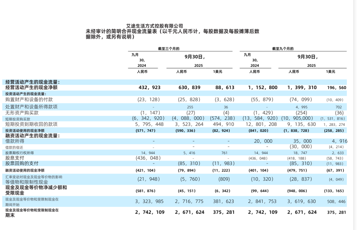 现金及现金等价物与受限制现金。截至2025年9月30日,本公司现金及现金等价物与受限制现金的合计余额为27亿元人民币(3.75亿美元)。