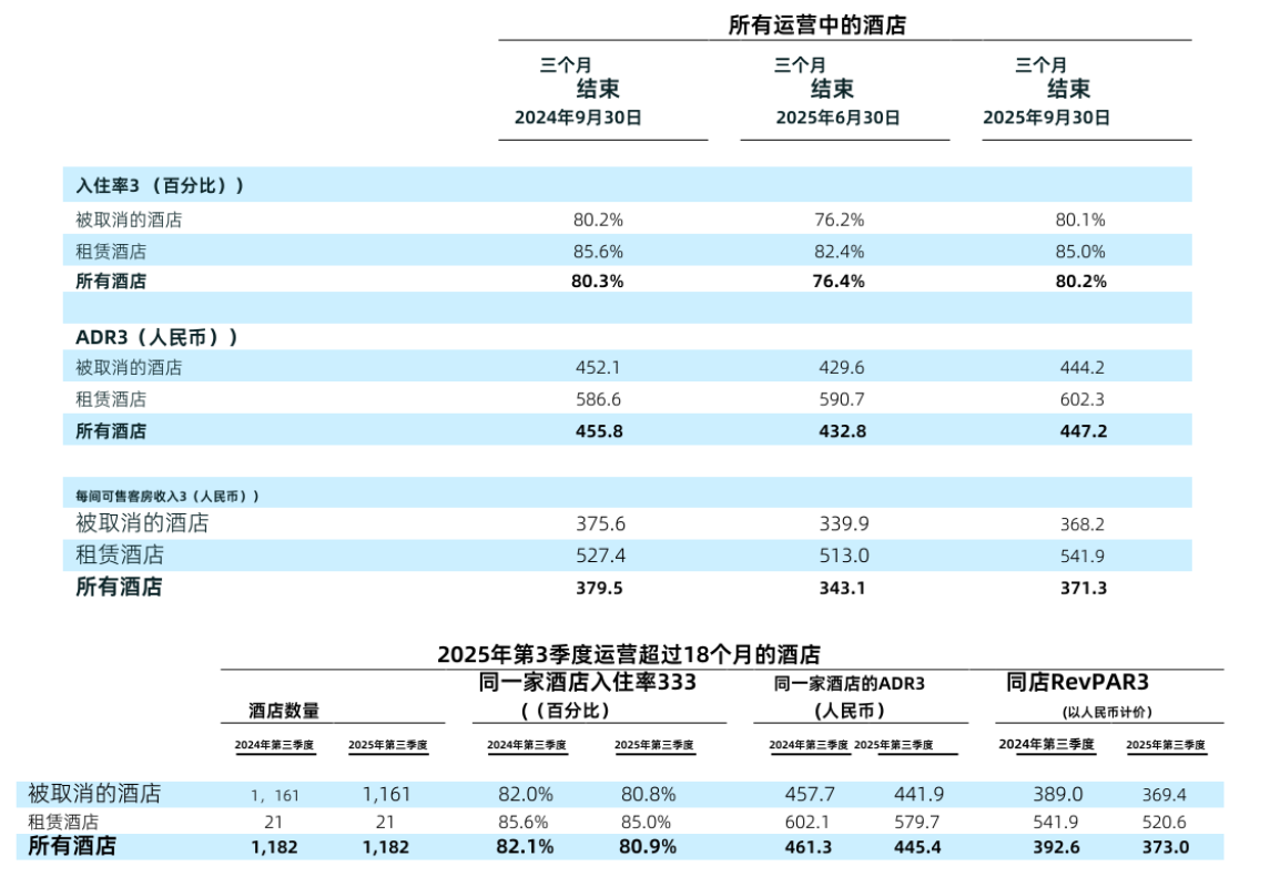 2025年第三季度的平均每日房价(“ADR”)为人民币447元,而2024年同期为人民币456元,上一季度为人民币433元。
