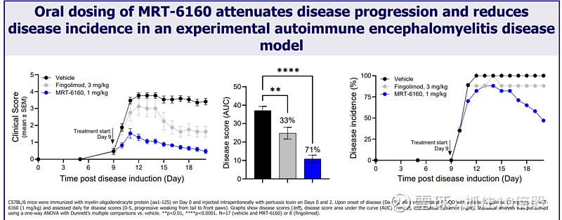 降解 VAV1 可抑制 T 细胞和 B 细胞的活化以及细胞因子的产生,并抑制 B 细胞分化为浆母细胞以及随后的 IgG 生成。口服 MRT-6160 可抑制实验性自身免疫性脑脊髓炎(EAE)的疾病进展、严重程度和发病率,同时降低脊髓中的促炎细胞因子水平,减少脊髓免疫细胞浸润和脱髓鞘。MRT-6160 可降低 EAE 小鼠脊髓中 T 细胞活化和促炎基因的表达。鉴于其体内疗效和作用机制特征,这些数据表明 MRT-6160 在缓解淋巴细胞介导的自身免疫和炎症性疾病(包括炎症性肠病、类风湿性关节炎、多发性硬化症和银屑病)的症状方面具有巨大潜力。MRT-6160 目前正在健康受试者中进行测试(NCTO6597799)。