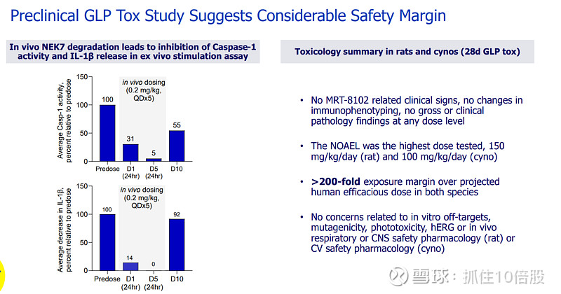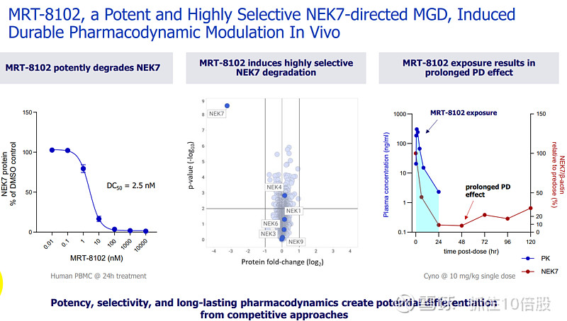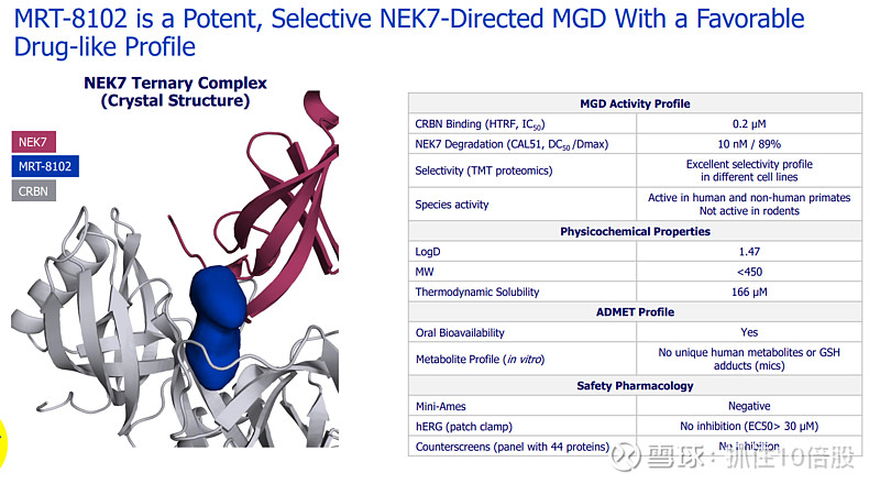 利用分子胶降解剂降解 NEK7 是一种通过 NLRP3 炎性小体靶向白细胞介素 -1 的新方法。分子胶降解剂 MRT-8102 是一种选择性、强效且持久的 NEK7 降解剂。MRT-8102 在体外和体内均能抑制 NLRP3 炎性小体,并在兔痛风模型中显示出治疗活性。MRT-8102 有望应用于痛风及其他炎症性疾病。