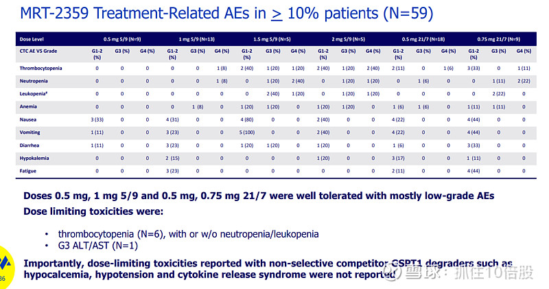 剂量为 0.5 毫克、1 毫克 5/9 以及 0.5 毫克、0.75 毫克 21/7 的药物耐受性良好,不良事件大多为轻度。剂量限制性毒性反应为:血小板减少症(N=6),伴或不伴中性粒细胞减少/白细胞减少,3 级谷丙转氨酶/谷草转氨酶升高(N=1)。重要的是,使用非选择性竞争性 GSPT1 降解剂时报告的剂量限制性毒性反应,如低钙血症、低血压和细胞因子释放综合征等,在本研究中均未出现。