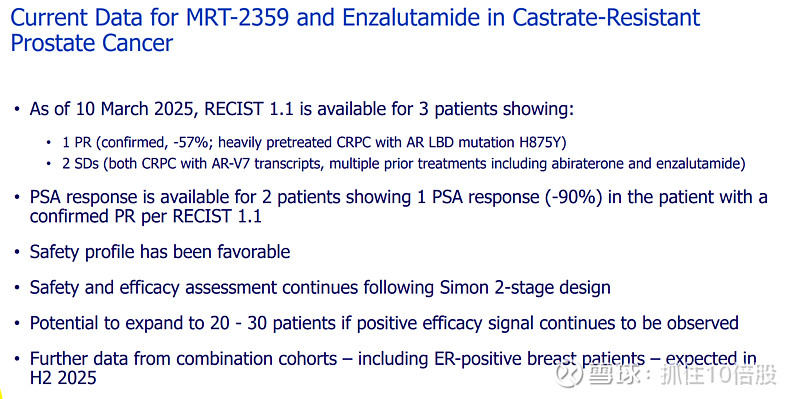 在去势抵抗性前列腺癌(CRPC)中早期数据令人鼓舞:在前 3 名可评估的、经过大量前期治疗且存在 AR 突变或 AR-V7 表达的患者中,有 1 名患者部分缓解(PR),2 名患者病情稳定(SD)。如果疗效信号持续为阳性,将有机会招募 20 至 30 名患者。这是一个需求巨大且未得到充分满足的适应症,无需基于生物标志物选择患者。