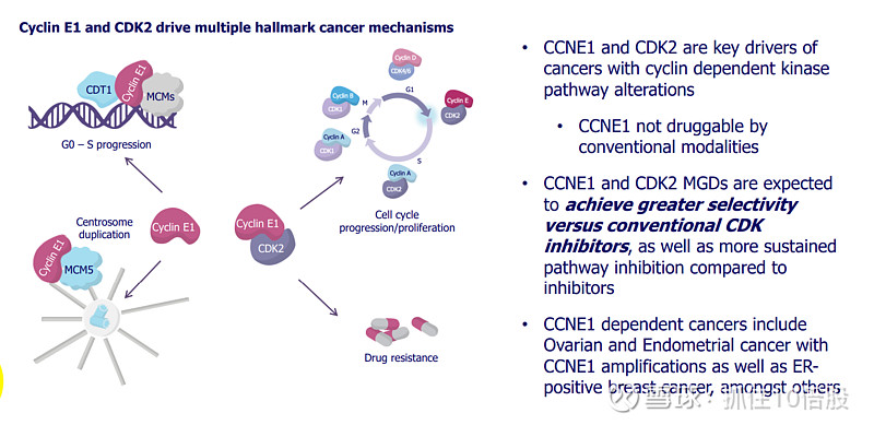 CCNE1 和 CDK2 是具有细胞周期蛋白依赖性激酶通路改变的癌症的重要驱动因素。CCNE1 无法通过常规疗法进行药物治疗。CCNE1 和 CDK2 的 MGD(多靶点药物)有望比传统的 CDK 抑制剂具有更高的选择性,并且在抑制通路方面比抑制剂具有更持久的效果。依赖于 CCNE1 的癌症包括卵巢癌和子宫内膜癌(伴有 CCNE1 增强突变)以及 ER 阳性乳腺癌等。