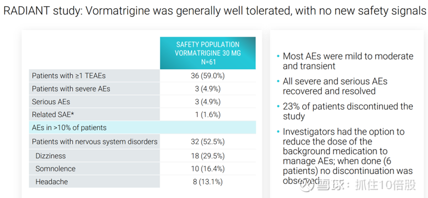 Vormatrigine的总体耐受性良好,继续显示出良好的安全性,报告的大多数不良事件是轻至中度和暂时的,所有严重不良事件均已恢复并得到解决。但是有23%的患者终止了研究。