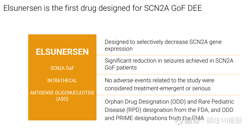 Elsunersen是首个针对 SCN2A 基因显性致病突变所致发育性癫痫性脑病(DEE)设计的药物。旨在选择性降低 SCN2A 基因表达。在 SCN2A 功能获得性患者中显著减少癫痫发作。未出现与研究相关的治疗新发或严重不良事件。获得美国食品药品监督管理局(FDA)的孤儿药认定(ODD)和罕见儿科疾病(RPD)认定,以及欧洲药品管理局(EMA)的孤儿药认定(ODD)和优先药物(PRIME)认定。