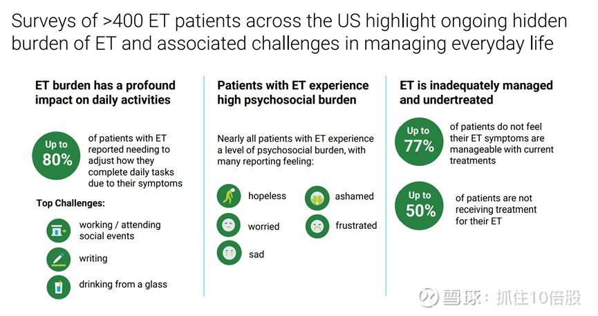 原发性震颤是最常见的运动障碍,仅在美国就影响约 700 万人,代表着数十亿美元的商业机会。原发性震颤的特征是上肢出现不自主的节律性震颤,有时还伴有头部、声带或腿部的震颤。这些震颤严重干扰日常生活,且具有进行性特点,随着病情的发展,震颤的严重程度和幅度通常会增加。普萘洛尔是一种β受体阻滞剂,是目前唯一获批用于治疗原发性震颤的药物,但疗效有限且耐受性差,对于患有原发性震颤的患者中相当一部分存在的合并症也是禁忌。其他β受体阻滞剂和抗惊厥药也常被用于治疗,但同样存在疗效有限和耐受性差的问题。绝大多数患者没有治疗选择,估计至少有 200 万患者寻求治疗。在一项患者调查中,多达 77% 的患者认为其原发性震颤控制不佳,多达 50% 的患者未接受治疗。事实上,接受调查的美国神经科医生表示,他们接诊的患者中有 85% 是为了寻求治疗,而 40% 的患者并未接受任何治疗。这些发现凸显了对特发性震颤(ET)更有效治疗方法的需求。