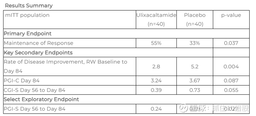 假设 3 和假设 4 进一步证实了ulixacaltamide与安慰剂相比的效果的精确性。