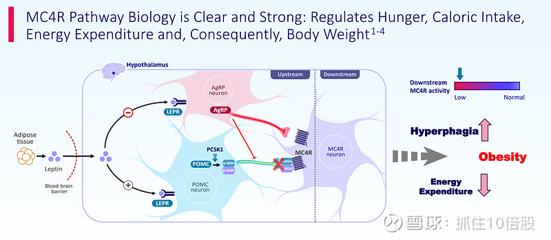 POMC神经元(“饱腹”神经元):被激活后,会释放α-MSH。如下图所示,α-MSH作为激动剂,像一把正确的钥匙,插入下一级神经元上的MC4R受体,传递 “能量充足,停止进食,增加消耗” 的指令。