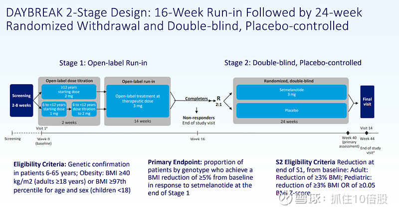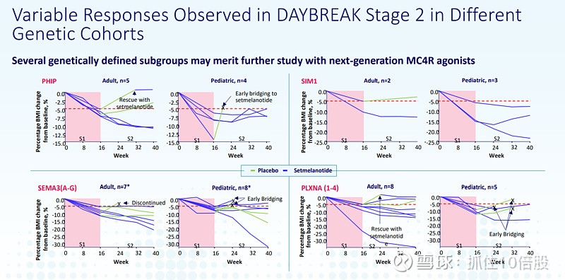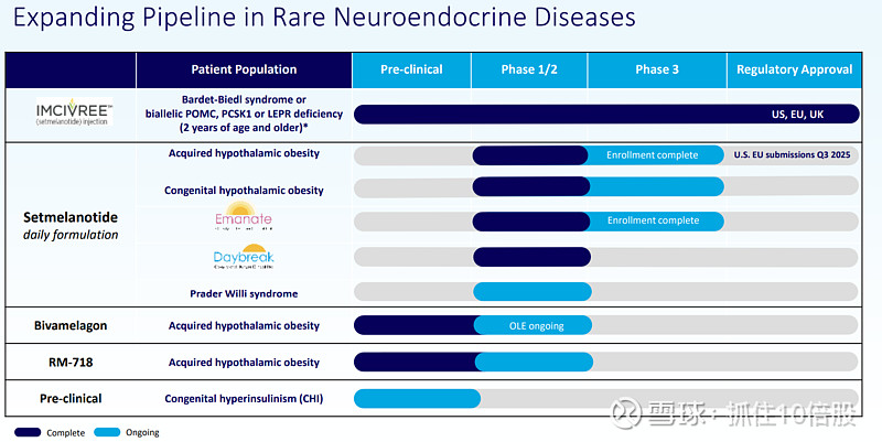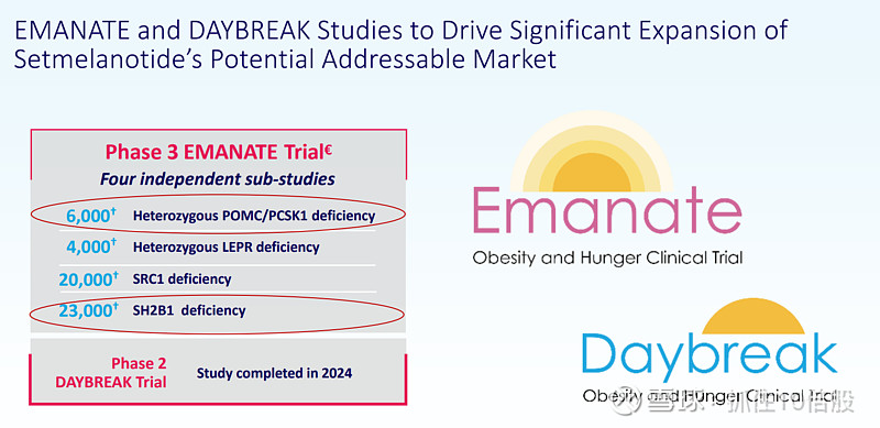EMANATE 和 DAYBREAK 研究将推动Setmelanotide潜在适用市场的显著扩大。针对杂合POMC/PCSK1缺乏症、杂合型LEPR缺乏症、SRC1缺乏症、SH2B1缺乏症。
