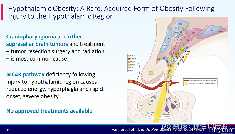 下丘脑性肥胖是一种罕见的继发性肥胖症,由下丘脑区域受损引起。下丘脑区域受损后导致的 MC4R 通路缺陷会引起能量减少、暴饮暴食以及快速发作的严重肥胖症。当前没有获批疗法。在美国有5000-10000名患者,欧洲有3500-10000名患者。