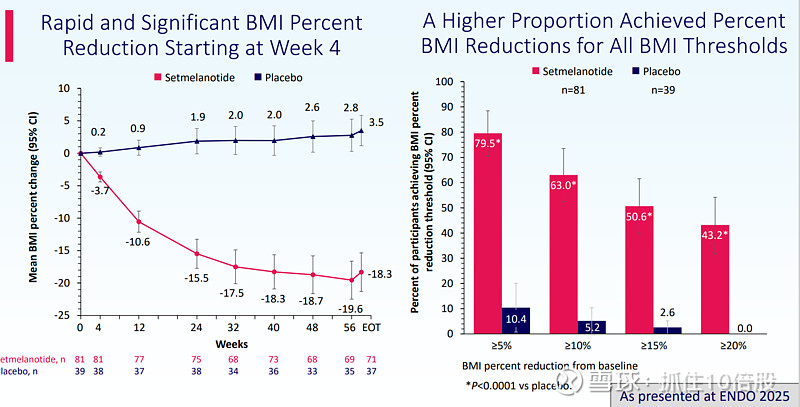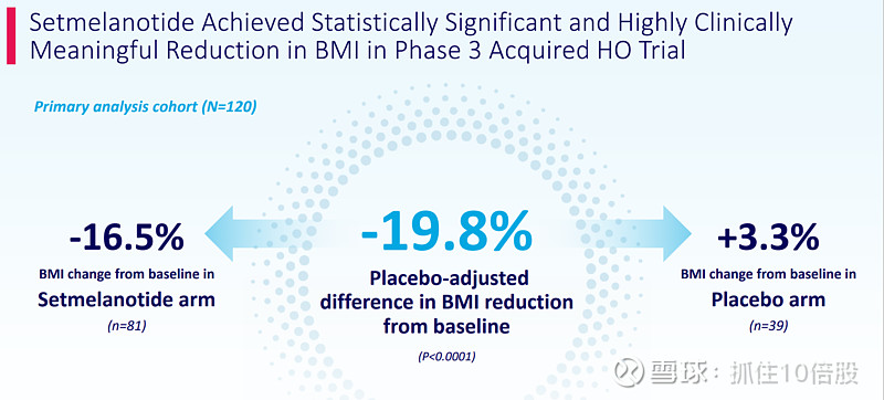 •主要终点显示,所有接受Setmelanotide治疗的患者(n=81)的平均BMI较基线降低了-16.5%,而安慰剂组(n=39)的BMI变化为+3.3%,52周时差异显著(p<0.0001);