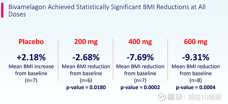 600 mg组:BMI平均降低9.3%(p=0.0004)。400 mg组:BMI平均降低7.7%(p=0.0002)。200 mg组:BMI平均降低2.7%(p=0.0180)
