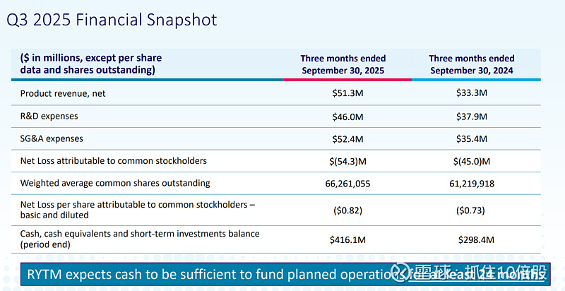 根据Rhythm Pharmaceuticals公布的2025年第三季度财报,其全球产品收入为5130万美元,保持了连续增长。2025年前九个月的累计收入已达到1.375亿美元。Setmelanotide最大的增长潜力来自于其针对获得性下丘脑肥胖症的拓展。据分析人士估计,其销售峰值有望达到20亿美元。其中美国被视为最核心的市场,预计峰值销售额可达15亿美元。欧盟:预计峰值销售额为3.4亿美元。日本:预计峰值销售额为1.8亿美元。公司目前持有现金4.1亿美元,可以支持未来2年的运营。