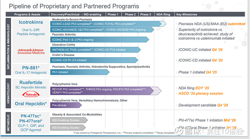 管线高度聚焦于血液疾病和免疫疾病两大领域。主力产品Icotrokinra和Rusfertide分别针对百亿级美元市场,且均获得FDA突破性疗法认定,临床数据优异