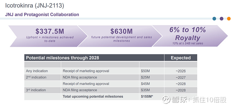 Icotrokinra的临床与商业化由强生主导,目前收到首付及里程碑共计3.37亿美元。未来潜在里程碑6.3亿美元。此外公司有权收到6-10%的销售收入分成,在≥40亿时为10%。公司预计销售峰值为50亿美元。