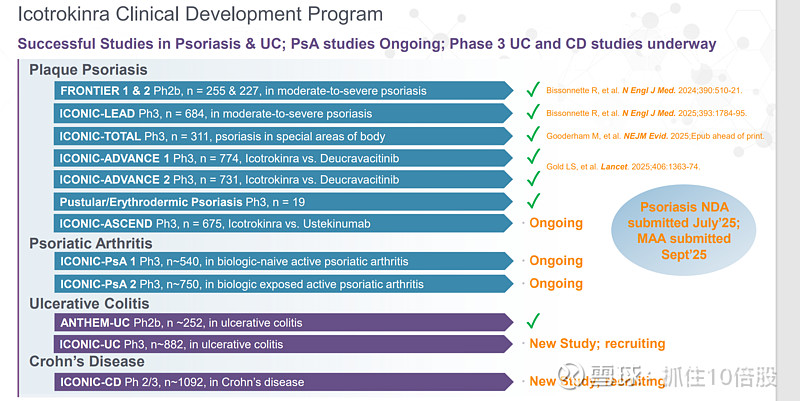 银屑病关节炎:ICONIC-PsA 1 Ph3(正在进行), ICONIC-PsA 2 Ph3(正在进行)