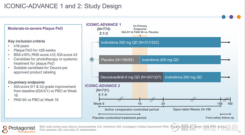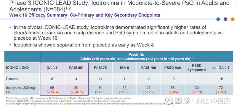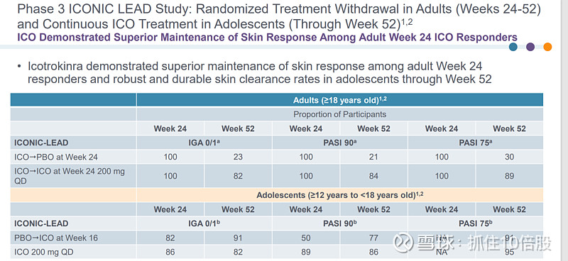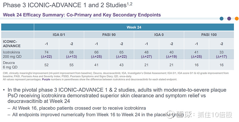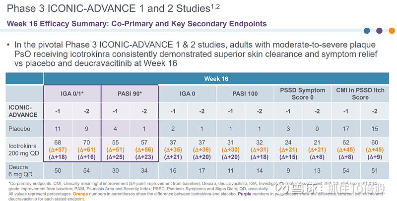 在第 16 周和第 24 周时,Icotrokinra与氘代来可昔替尼相比,在达到 PASI 75、90、100、IGA 0/1 和 IGA 0 以及通过 PSSD 0 评估无症状方面的表现均更优。