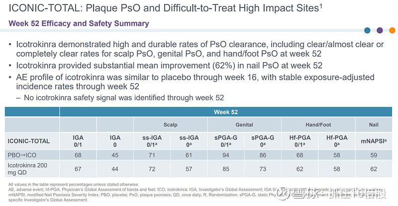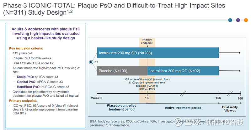 Ph3 ICONIC-TOTAL:斑块状银屑病及难治性高影响部位(N=311)研究。