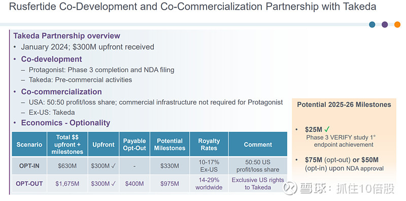 Rusfertide是一种铁调素(hepcidin)模拟肽类药物,由武田制药与Protagonist Therapeutics联合开发。首付为3亿美元,公司可以选择14-29%销售收入分成,或者美国50%利润分成+美国以外地区10-17%销售收入分成。公司预计其销售峰值为10-20亿美元。