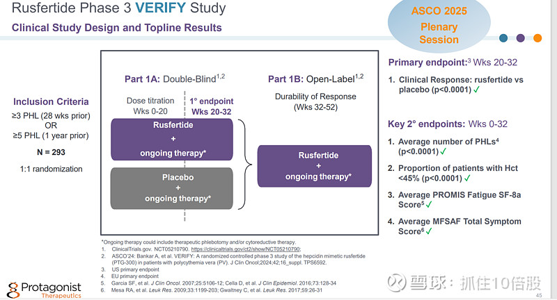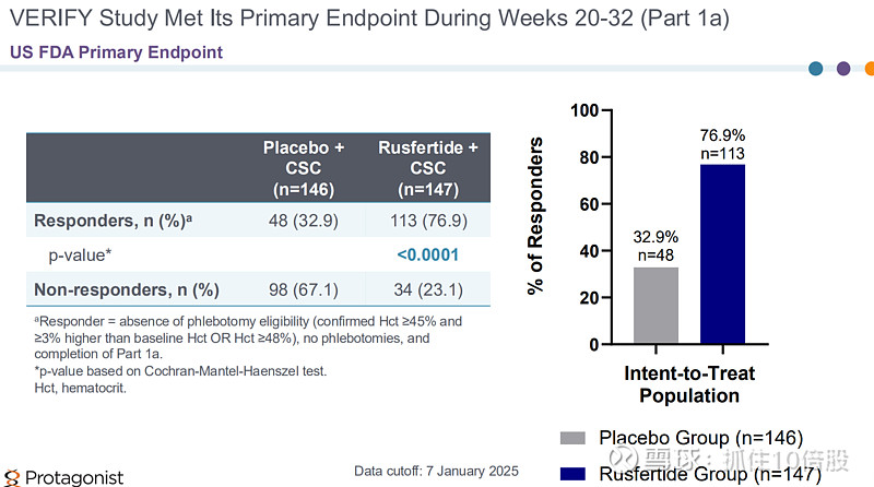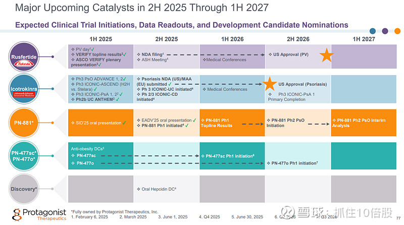 2025年6月公司展示了Rusfertide 3期临床 VERIFY研究的结果。结果显示安慰剂+标准疗法的响应率为32.9%,Rusfertide+标准疗法的响应率为76.9%(P<0.0001)。研究达到了主要终点和所有次要终点。公司已经提交了NDA申请,预计2026年获批。