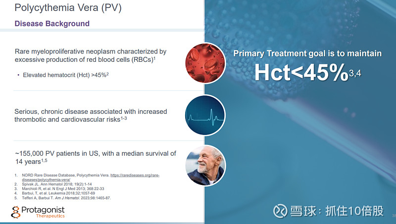 真性红细胞增多症(PV) 是一种罕见的骨髓增殖性肿瘤,其特征为红细胞(RBC)过度生成。 红细胞压积(Hct)升高超过 45% 。严重的、慢性疾病会增加血栓形成和心血管方面的风险。美国约有 155000 名 PV 患者,其平均生存期为 14 年。