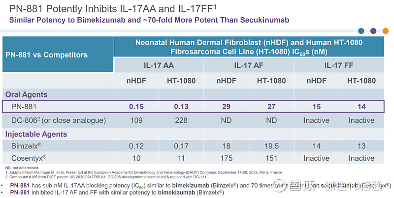 PN-881是一种口服IL-17多肽拮抗剂,目前处于一期临床。拟开发银屑病、银屑病关节炎、化脓性汗腺炎、脊柱关节炎等适应症。