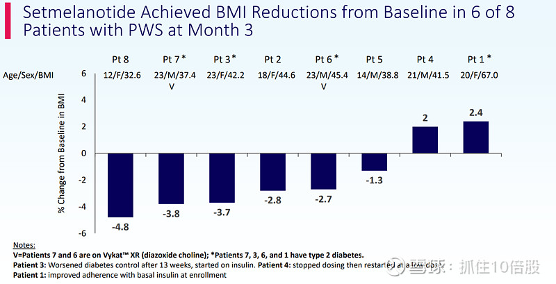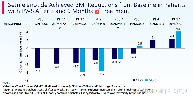 - 8名完成3个月Setmelanotide治疗的患者中,6人实现BMI较基线下降;