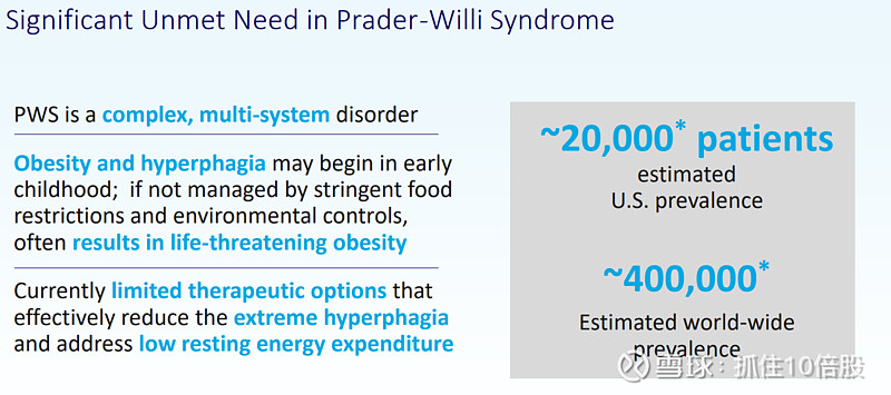 普拉德-威利综合征是一种罕见的遗传性疾病,可导致多种身体、精神及行为问题。该疾病的核心特征之一是患者从约2岁开始出现持续的饥饿感。据估计,全球约有40万人患有普拉德-威利综合征,美国约有2万人患病。目前,针对普拉德-威利综合征相关的严重食欲亢进及静息能量消耗降低,有效的治疗方案十分有限。