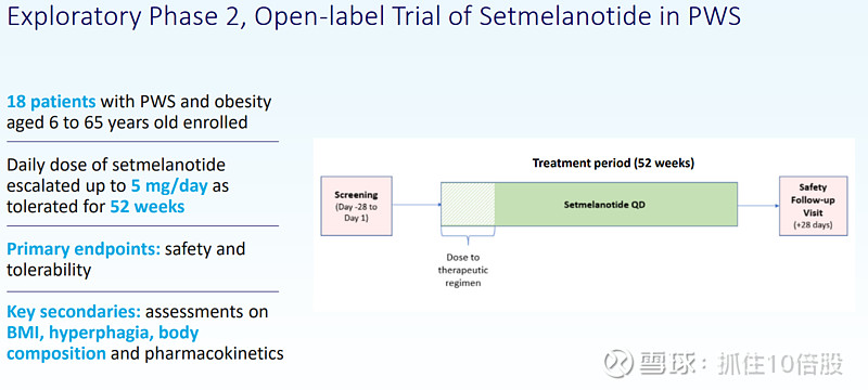 该试验是一项单中心、开放标签的2期研究,旨在评估Setmelanotide治疗普拉德-威利综合征的疗效。试验最初设计为期26周,后延长至52周,以便早期入组患者能继续接受治疗。