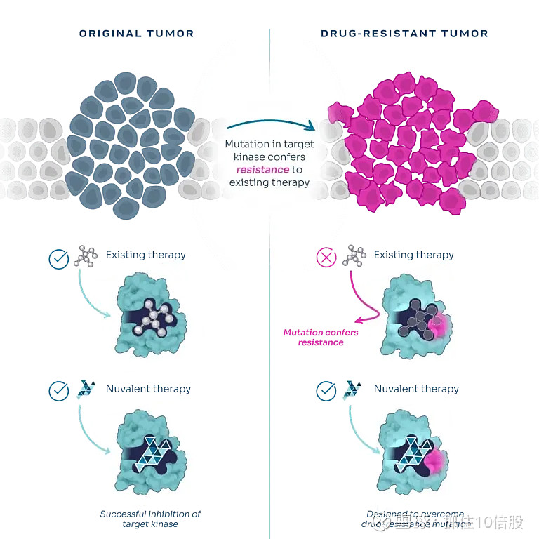 癌细胞不断发生突变。使用现有的激酶抑制剂进行治疗往往会导致出现携带新突变的癌细胞。这些突变可能会使现有疗法失效。Nuvalent设计创新的分子结构,能够精准作用于原发性癌症中的靶激酶以及耐药性癌症中的突变靶激酶。这使得公司的疗法能够同时治疗原发性肿瘤以及出现耐药性突变的肿瘤。