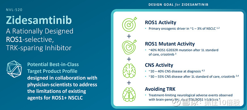 Zidesamtinib是一种新型的可穿透大脑的针对 ROS1 的选择性抑制剂,其研发旨在满足以下综合医疗需求:针对由 ROS1 引发且对现有 ROS1抑制剂已产生抗药性的肿瘤,包括具有普遍存在的 G2032R“溶剂前沿”耐药性突变的肿瘤进行治疗;避免抑制结构上相关的肌动蛋白丝结合蛋白激酶(TRK)家族;治疗脑部转移。
