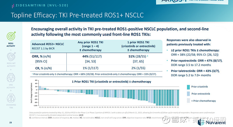 在已接受靶向药物治疗的ROS1阳性非小细胞肺癌患者群体中,促进了整体治疗效果的提升(ORR44%),并且在使用最常见的一线ROS1靶向药物后,也展现了二线治疗的效果(ORR51%)。