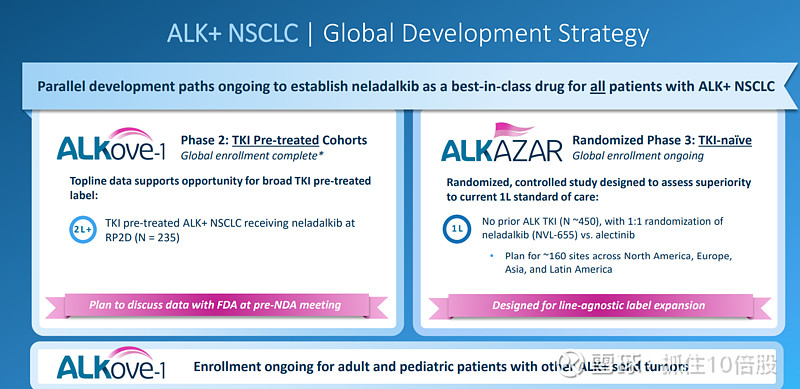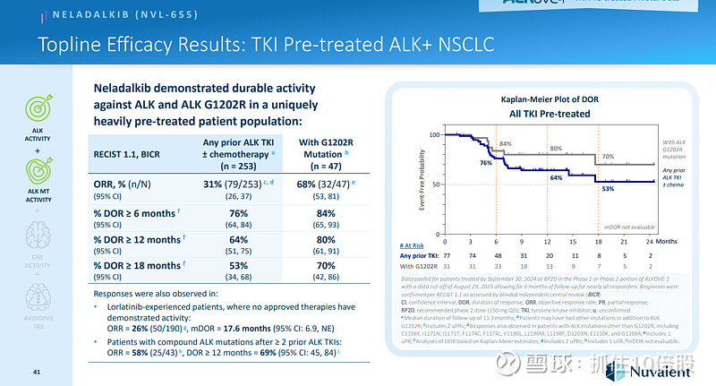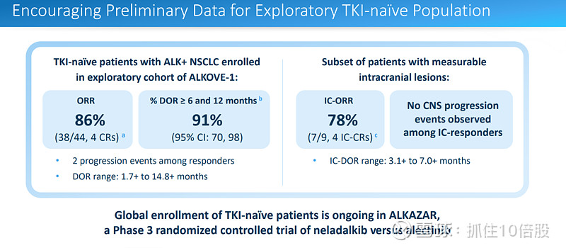 未使用过酪氨酸激酶抑制剂患者的ORR为86%。在 ALKAZAR 试验中,针对未曾使用过靶向药物治疗的患者的大规模入组工作正在进行中。该试验是针对neladalkib与阿来替尼的 3 期随机对照研究。