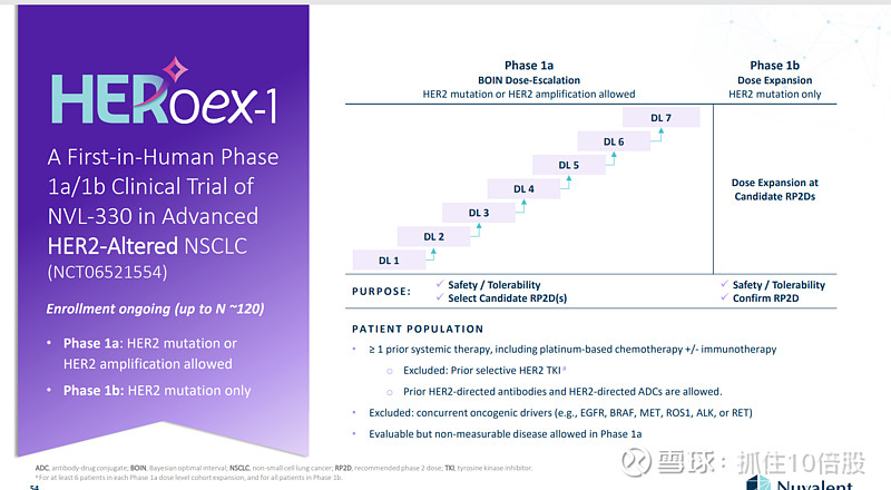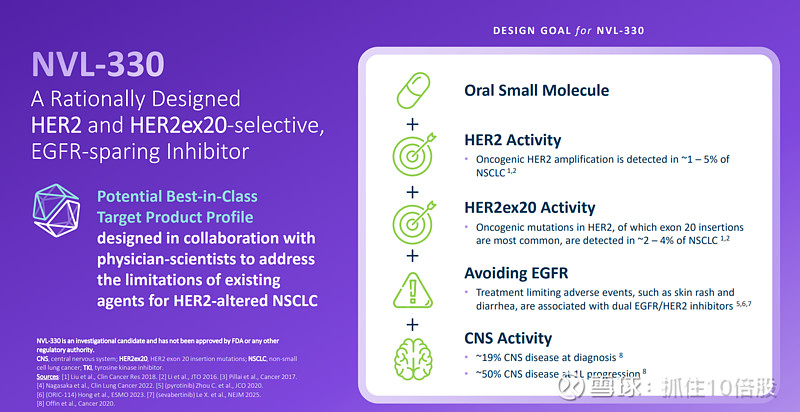 NVL-330 是一种新型的、可穿透血脑屏障的 HER2 选择性酪氨酸激酶抑制剂,其设计旨在满足以下综合医疗需求:治疗 HER2 突变肿瘤,包括具有 HER2 外显子 20 突变的肿瘤;避免因脱靶抑制野生型 EGFR 而导致的限制治疗的不良事件;以及治疗脑转移瘤。强调 HER2 选择性以尽量减少与抑制结构相关的野生型 EGFR 激酶相关的潜在剂量限制性不良事件,例如皮疹和胃肠道毒性。此外,NVL-330 已针对脑渗透性进行了优化,以潜在地改善脑转移患者治疗方案。