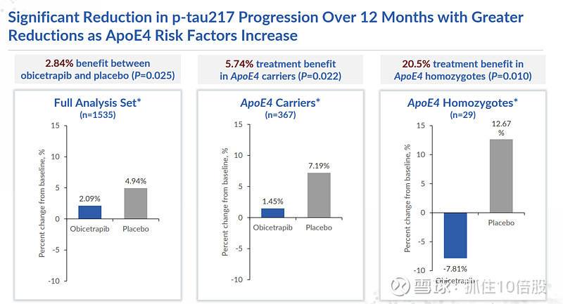 在PREVAIL试验的亚研究中,obicetrapib在12个月内显著减缓了AD核心生物标志物血浆p-tau217的进展,且在携带ApoE4高危基因的患者中效果更为显著。这初步验证了其通过调节脂质代谢干预神经退行性疾病的假说。尽管此适应症仍处早期探索阶段,但它为obicetrapib赋予了超越心血管领域的、巨大的长期想象空间和估值潜力。