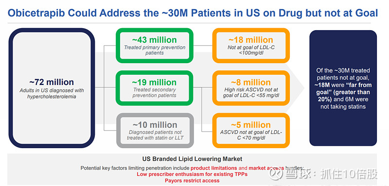 美国约有7200万高胆固醇血症成人患者,其中约 3000万已接受治疗但未达指南推荐的LDLC目标。
