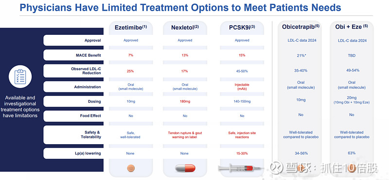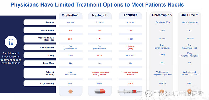 现有疗法: 他汀(基石)、依折麦布(效力中等、口服)、PCSK9单抗(注射、高效、但价格和给药方式限制使用)、贝派地酸(口服、中等效力、有肌病和痛风风险)。