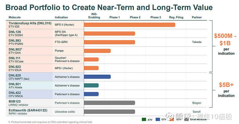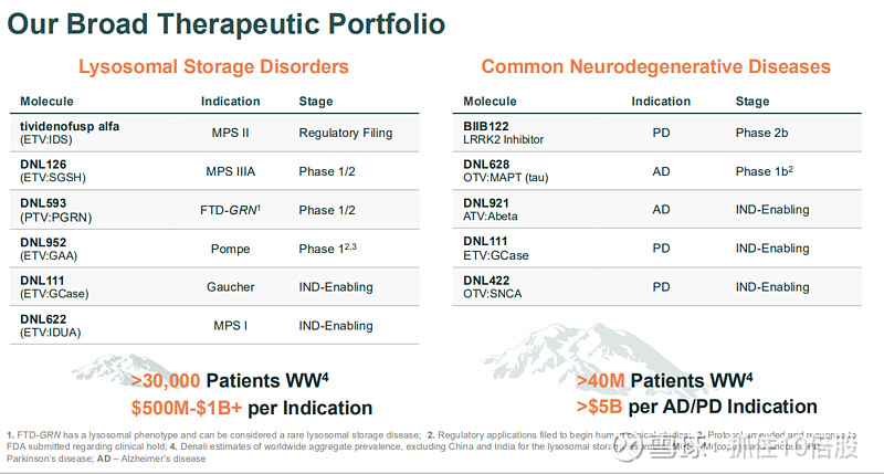 Denali的管线战略清晰:以经过临床验证的酶替代疗法在溶酶体贮积症领域建立商业基础和市场信誉,同时以更具潜力的抗体和寡核苷酸疗法向阿尔茨海默病、帕金森病等常见神经退行性疾病市场进军。