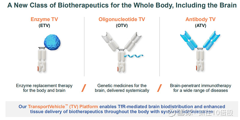 作用机制:该平台巧妙地利用了大脑内皮细胞上高表达的转铁蛋白受体。TfR在人体内负责运输铁,其介导的内吞作用是将物质从血液运入大脑的天然途径。TV技术将治疗性“货物”(酶、抗体、寡核苷酸)与经过工程化改造的、能结合TfR的抗体Fc片段融合,从而“搭乘”这一自然运输系统进入大脑和全身其他难以到达的组织(如骨骼、软骨)。