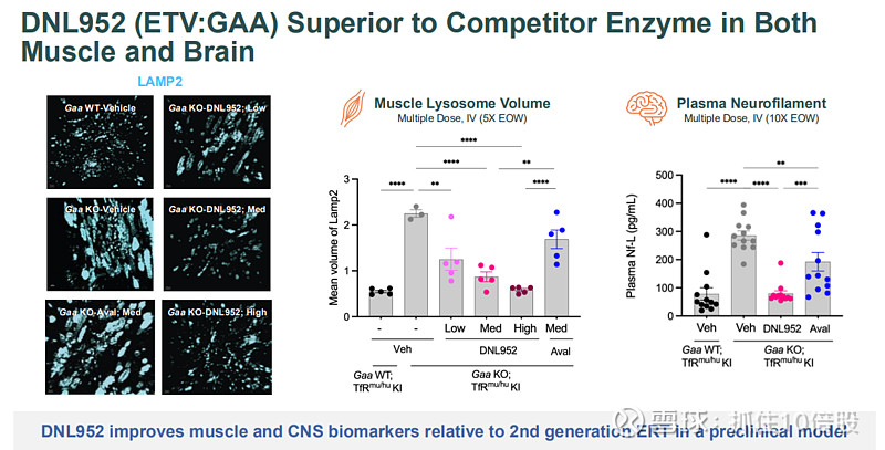 临床前证据:在庞贝病小鼠模型中,DNL952在降低肌肉溶酶体体积和血浆神经丝轻链(神经损伤标志物)方面,效果优于第二代标准疗法avalglucosidase alfa。已提交IND申请。