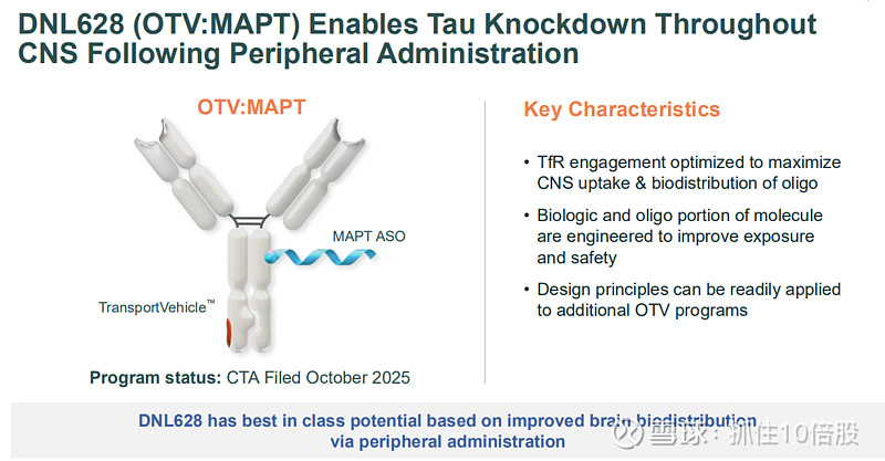 DNL628将靶向MAPT(编码Tau蛋白的基因)的反义寡核苷酸与TV融合,通过静脉给药抑制大脑中所有Tau蛋白的生成。