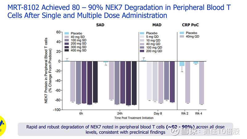 - 有效降解靶点:在测试的所有剂量水平下,均观察到外周血T细胞中约80-90%的NEK7蛋白被降解。