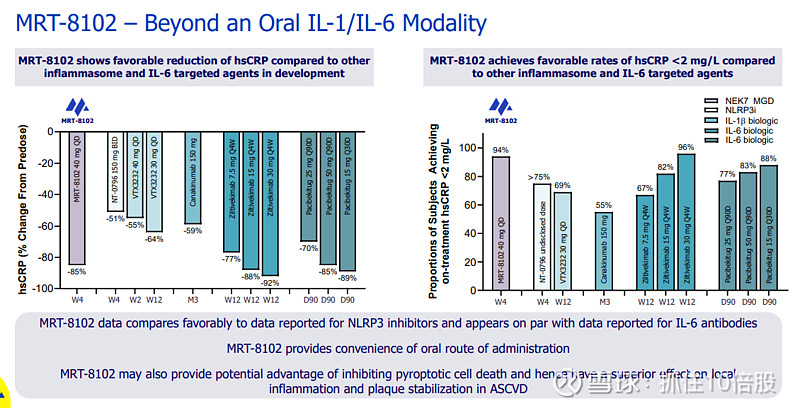 显著降低炎症标志物:MRT-8102在所有测试剂量下,均能在健康志愿者和高心血管疾病风险受试者中,引起超敏C反应蛋白(hsCRP)的快速、显著降低。